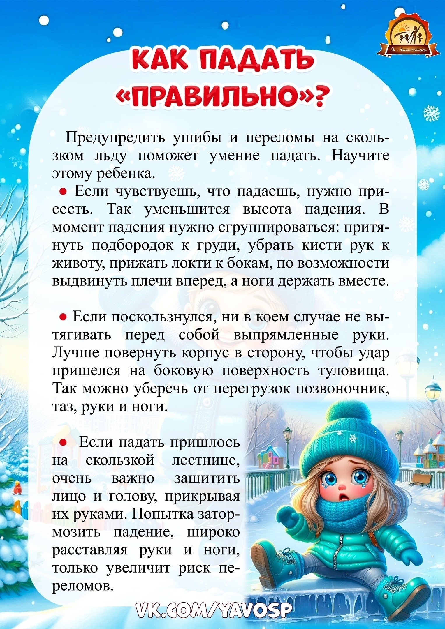 Гололёд является причиной множества травм и переломов. Научите ребенка перемещаться по скользкой улице: нужно не спешить, избегать резких движений, постоянно смотреть себе под ноги. Ноги должны быть слегка расслаблены и немного согнуты в коленях, корпус при этом чуть наклонен вперед. Держать руки в карманах в гололед опасно, при падении едва ли будет время их вынуть, что может привести к травме. Огромную опасность в гололед представляют ступеньки, по возможности избегайте их, если это невозможно, то ногу при спуске по лестнице необходимо ставить вдоль ступеньки, в случае потери равновесия такая позиция смягчит падение.