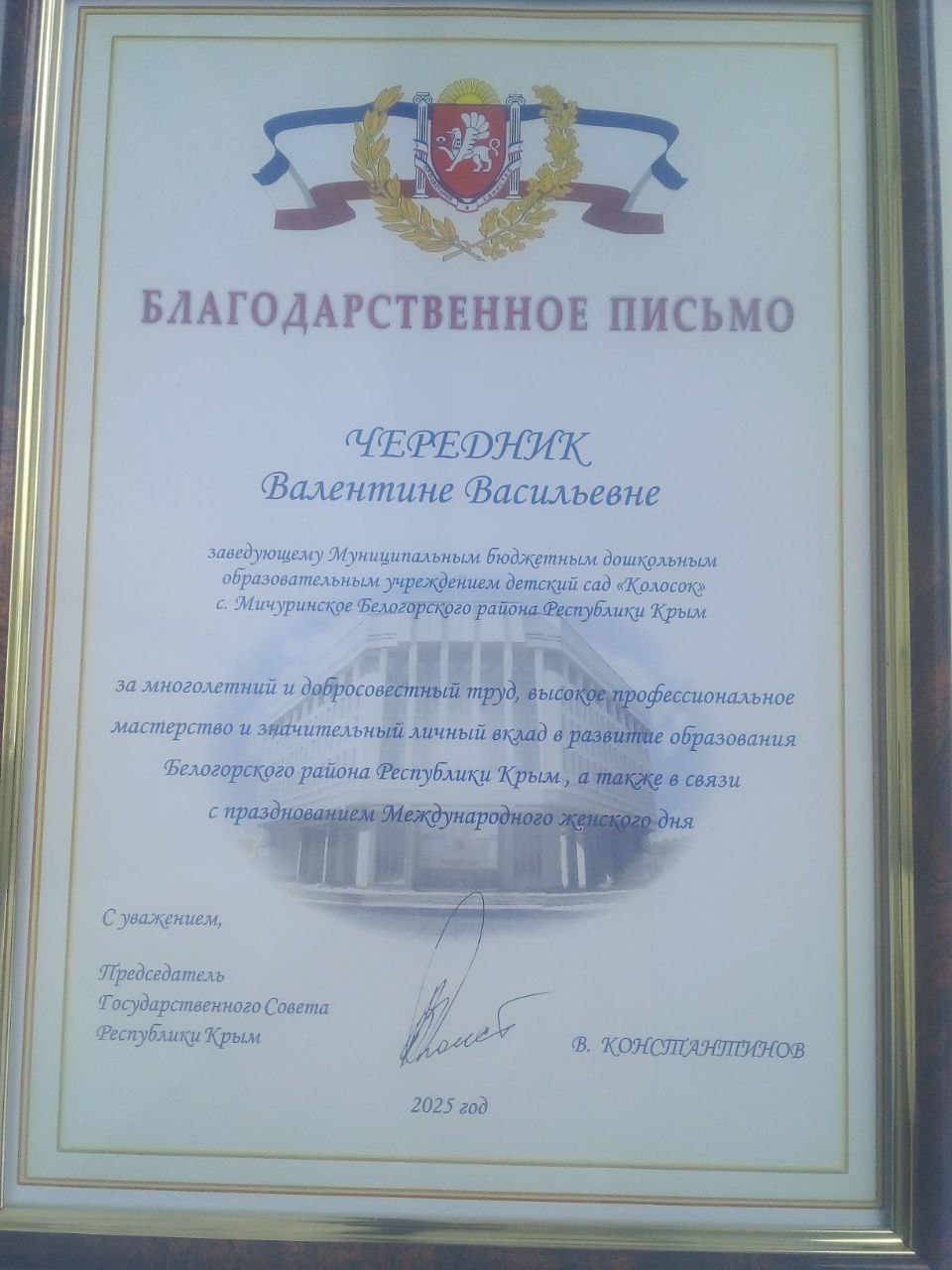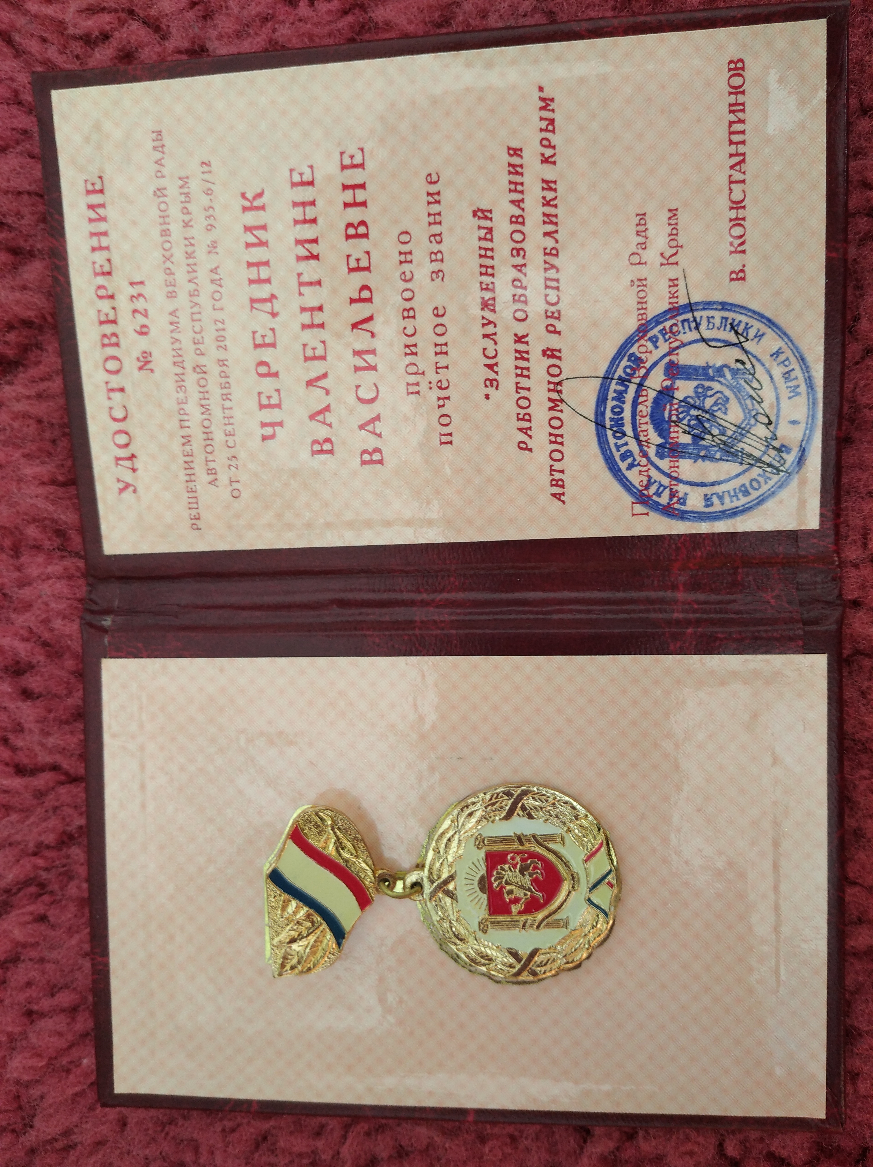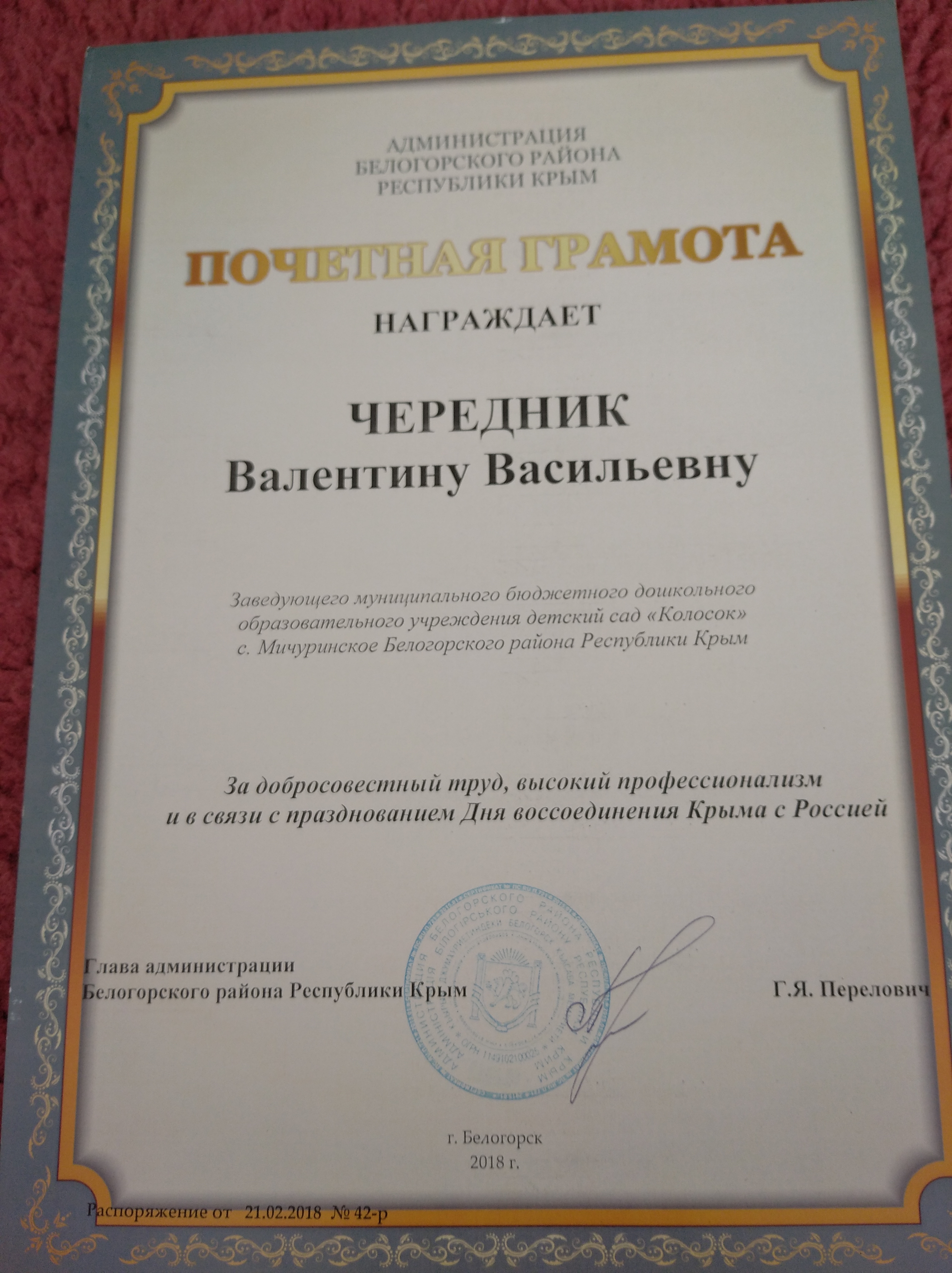 Награждается заведующий МБДОУ д/ "Колосок" с.Мичуринское Чередник Валентина Васильевна за многолетний добросовестный труд, высокий профессионализм, значительный вклад в развитие и совершенствование системы образования Республики Крым.