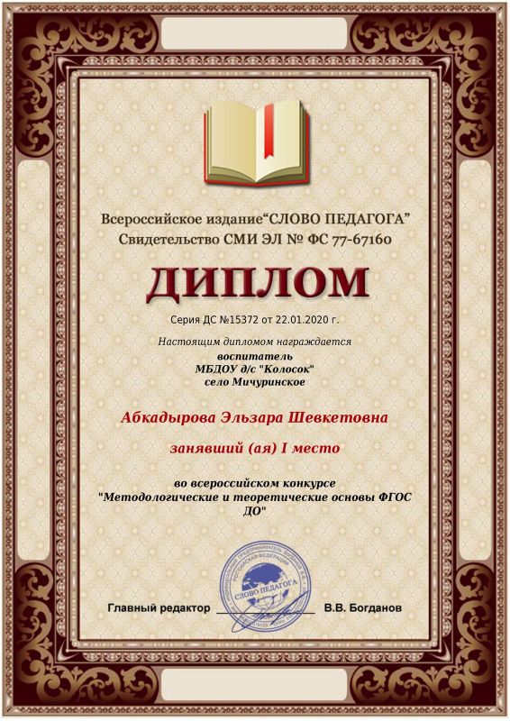 Награждается воспитатель Абкадырова Э.Ш., занявшая 1 место во Всероссийском конкурсе "Методологические и теоретические основы ФГОС ДО"