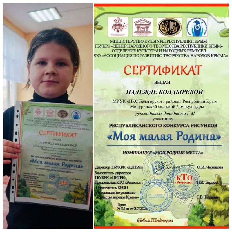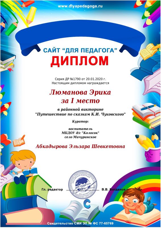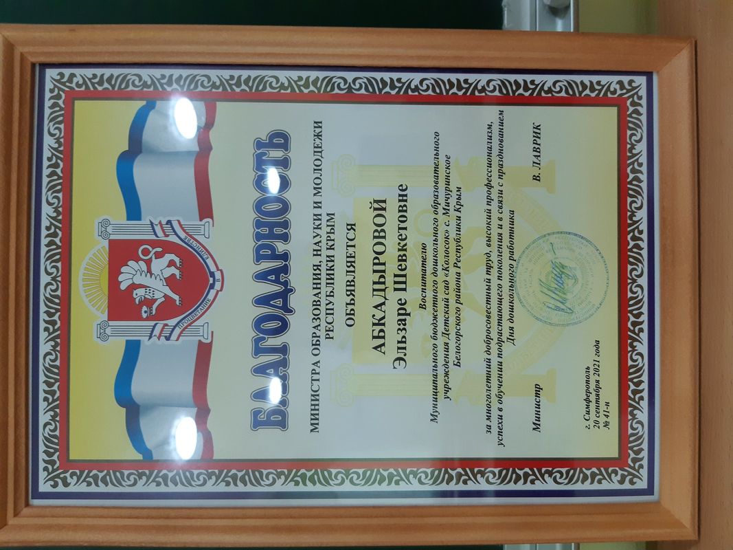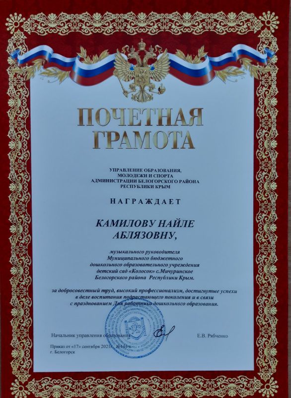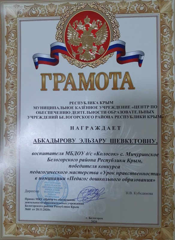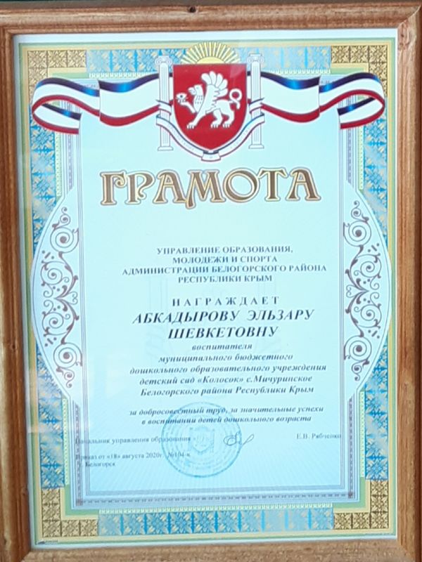 Награждается Абкадырова Эльзара Шевкетовна, воспитатеь МБДОУ д/с "Колосок" с.Мичуринское Белогорского района Республики Крым за добросовестный труд, за значительные успехи в воспитании детей дошкольного возраста.
