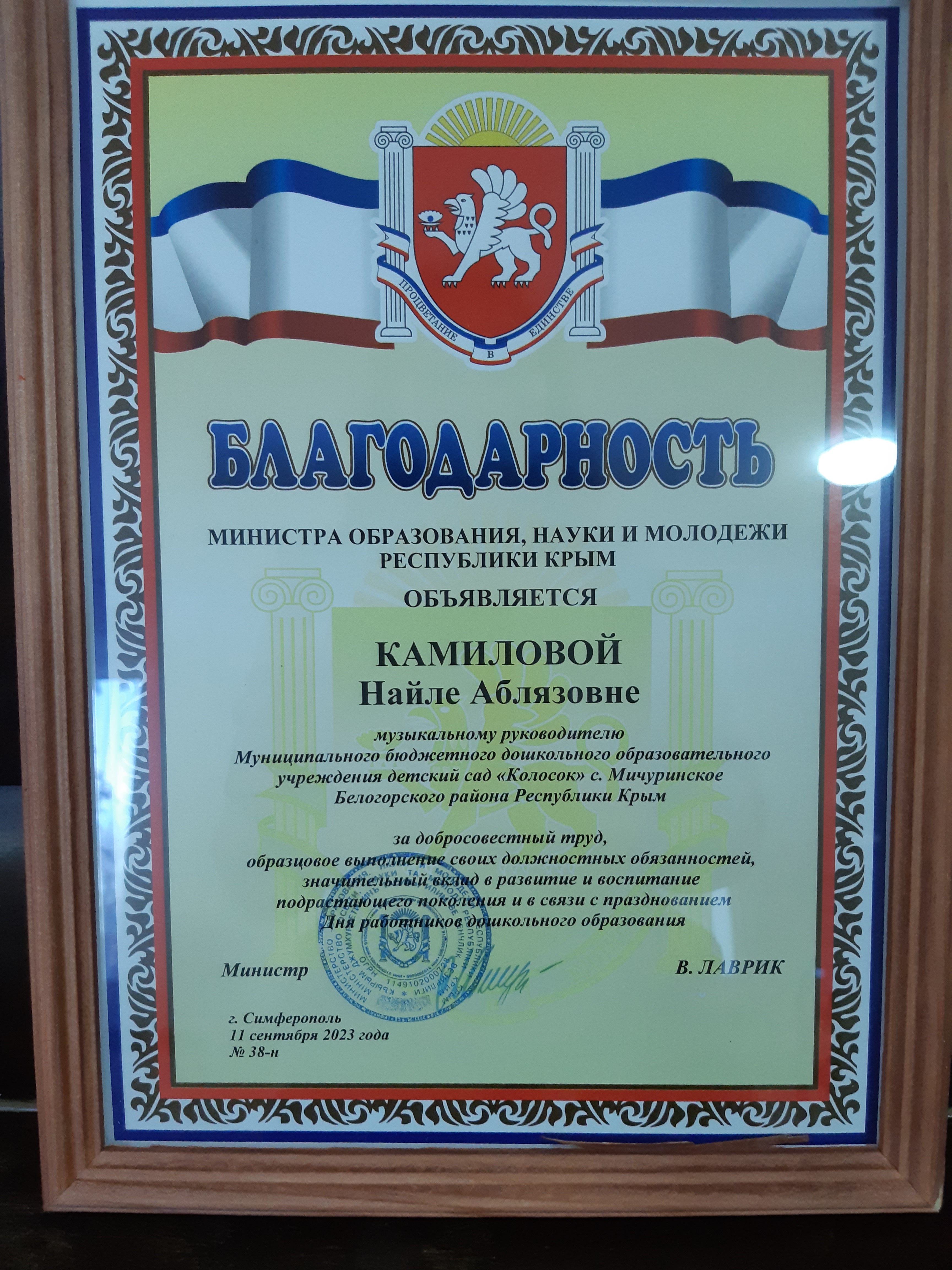 Благодарность Министра образования, науки и молодежи Республики Крым: