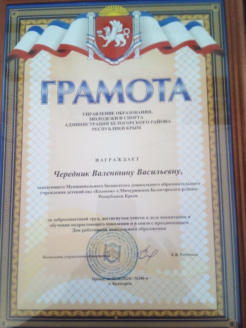 Почетная грамота Управления образования, молодежи и спорта Администрации Белогорского района Республики Крым: