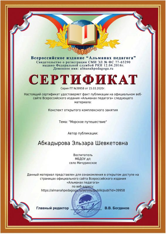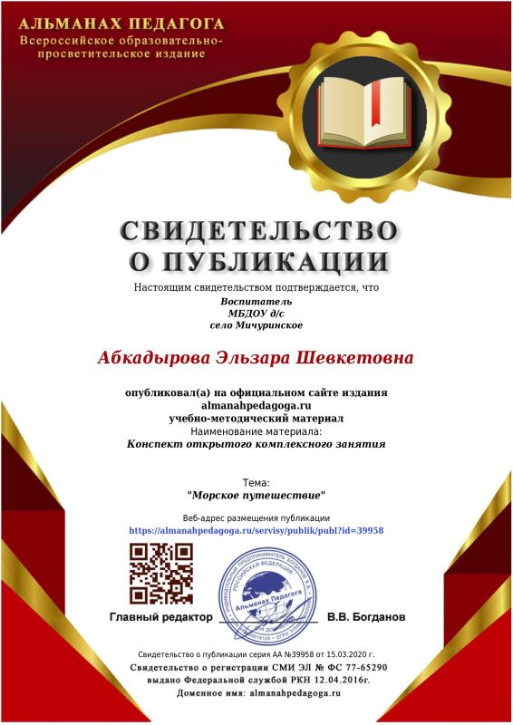 Сертификат, Свидетельство о публикации методических материалов воспитателя Абкадыровой Э.Ш.